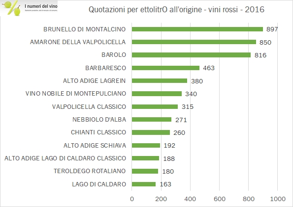 • Tra i vini rossi svettano naturalmente i tre grandi, Amarone della Valpolicella, Brunello di Montalcino e Barolo. I prezzi dell’Amarone sono calati del 2% nel 2016 a 850 euro per ettolitro, mentre il Brunello si conferma il vino più pregiato in termini di prezzi all’ingrosso a quasi 900 euro per ettolitro, in crescita del 2%. Non è però difficile notare che l’andamento è più vivace per i vini delle Langhe: il Barolo sale del 9% a 816 euro per ettolitro, mentre anche il Barbaresco ha iniziato una forte progressione, superando i 400 euro per ettolitri, +30% nel 2016. Andamenti positivi e superiori al 10% sono anche visibili per tutti i Barbera (e di Alba in particolare), il Cannonau di Sardegna e di nuovo, gli altri vini di Alba, sia Dolcetto (+28%) che Nebbiolo (+24%).