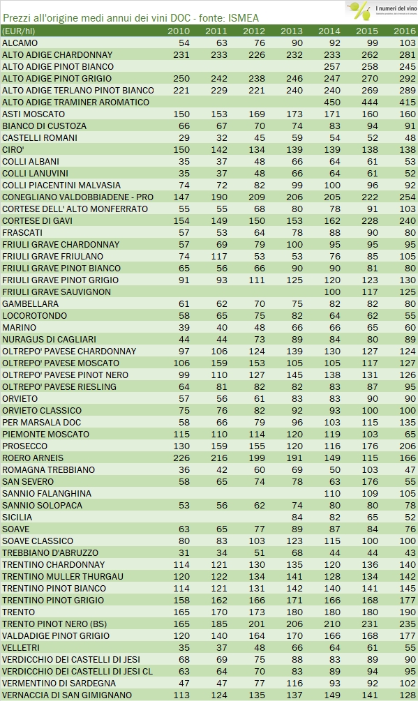 I prezzi all’origine dei vini DOC – aggiornamento 2016 su dati ISMEA