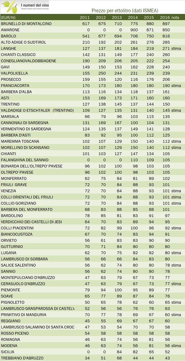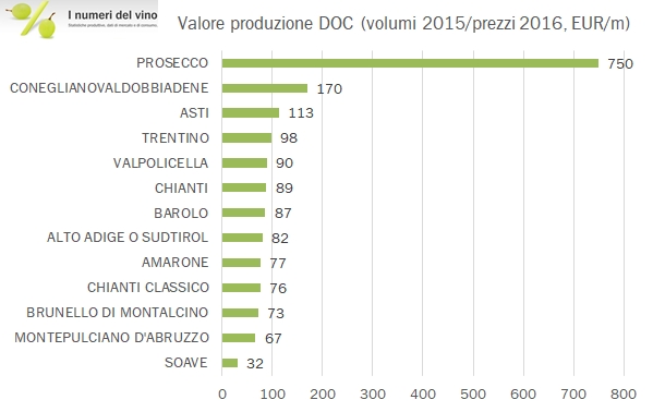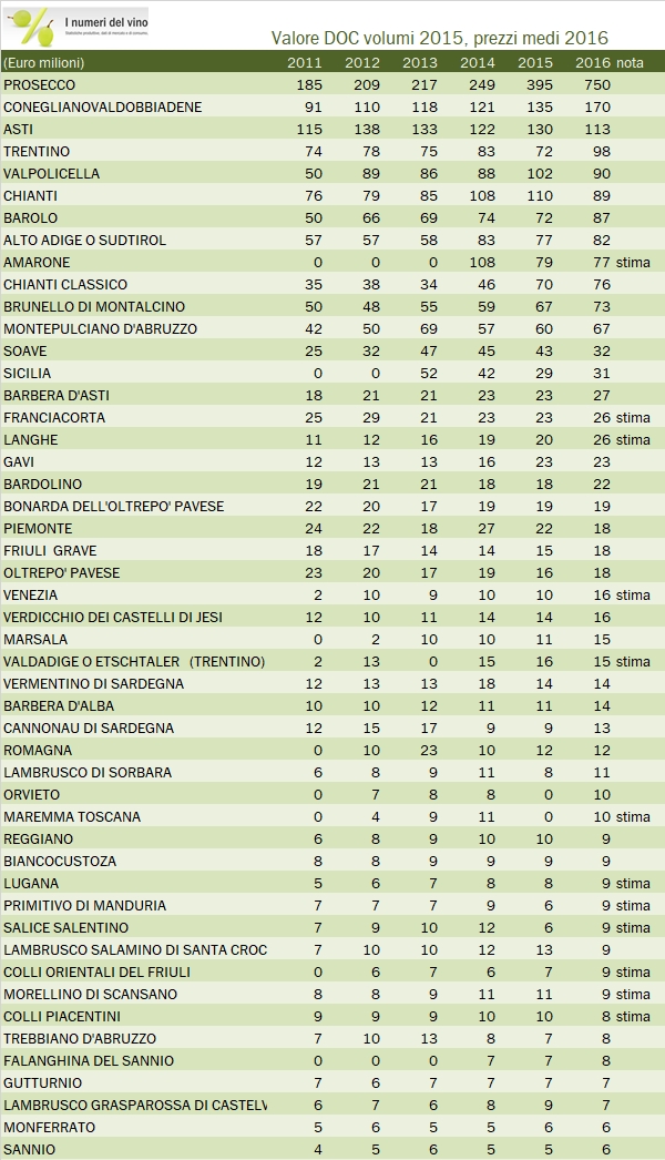 - Calando invece tra le grandi DOC, secondo le nostre stime, l’Asti (per cui usiamo i prezzi del Moscato, gli unici disponibili e stabili nel 2016) da 130 a 113 milioni, e tra i vini rossi il Chianti, -19% e il Valpolicella, -11%.