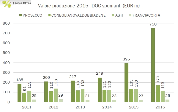 - Come dicevamo tra i vini spumanti si concentrano le DOC più importanti per valore, a fronte di volumi elevati e prezzi superiori alla media. Il Prosecco è balzato a un valore della produzione di 750 milioni dai 400 dello scorso anno, mentre il Conegliano Valdobbiadene cresce da 135 a 170 milioni, mantenendo un piccolo premio sui prezzi.