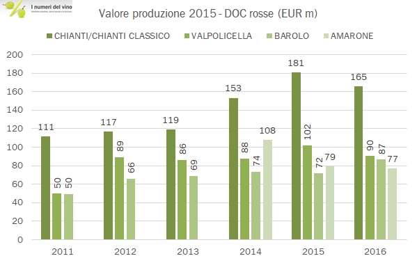 - Sono invece in crescita costante le altri grandi DOC rosse: il Chianti Classico cresce de 9% a 76 milioni di euro, il Barolo del 21% a 87 milioni di euro e il Brunello di Montalcino del 9% a 73 milioni. Non abbiamo purtroppo dati precisi sulla produzione di Amarone 2015, ma riprendendo quelli del 2014 arriviamo a un valore sostanzialmente stabile, viste le quotazioni del vino alla borsa merci.