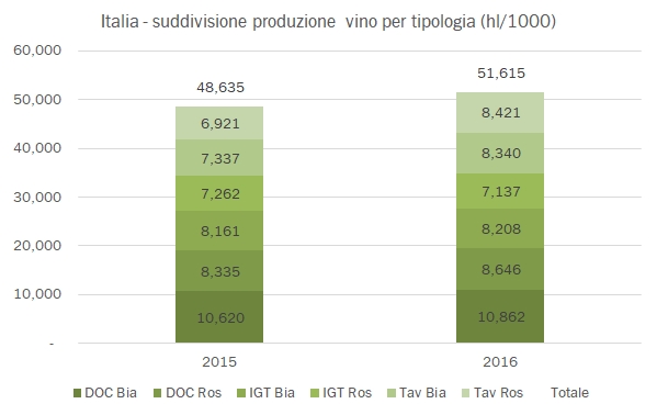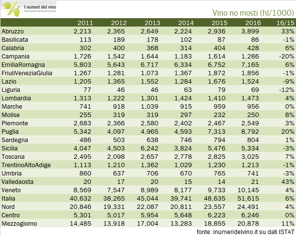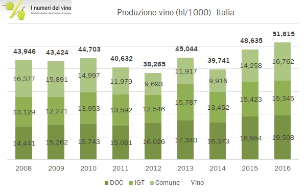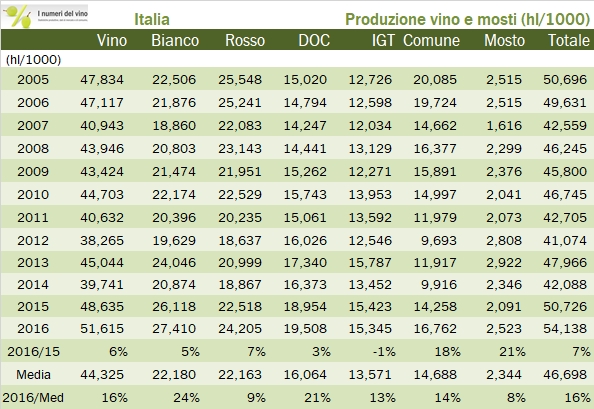 - Secondo i dati finali 2016 pubblicati da ISTAT, la produzione di vino italiana ha raggiunto nel 2016 quota 51.6 milioni di ettolitri, con un incremento del 6% rispetto al 2015 (era +3% nell’aggiornamento di marzo) e di ben il 16% sopra la media storica (13% prima). Scorrendo i dati, per trovare produzioni così elevate bisogna andare indietro al 2004.