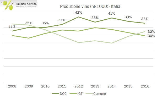 - La produzione di vino DOC cresce di conseguenza, toccando quota 19.5 milioni di ettolitri, +3% e il 21% sopra media. Questi sono dati molto simili alla release di marzo. La quota di vini DOC sul totale prodotto cala leggermente dal 39% al 38%, perché la categoria in forte crescita nel 2016 è in realtà quella dei vini da tavola, +18% a 16.7 milioni di ettolitri. Dopo il calo importante del 2013-14 e tornati a oltre il 30% della produzione. I vini IGT sono invece visti stabili da ISTAT a 15.3 milioni di ettolitri (-1%).