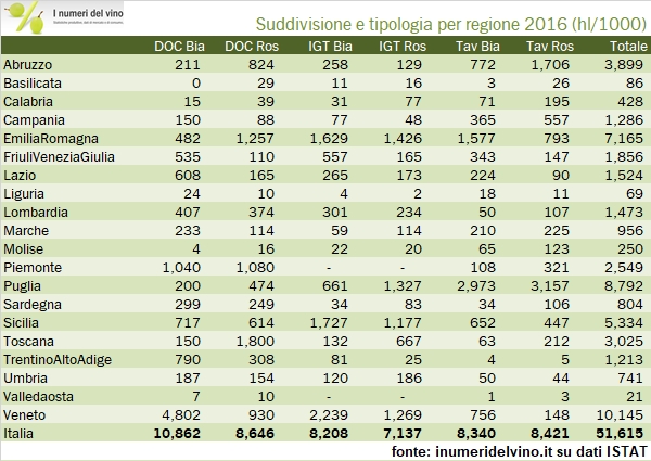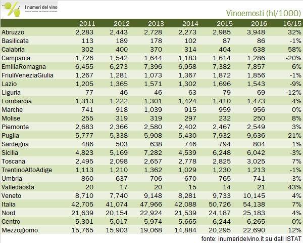 - Da un punto di vista geografico, la produzione è in crescita sia al Nord che al Sud (4% e 11% rispettivamente rispetto al 2015), mentre è stabile in centro Italia. Le stesse considerazioni si possono fare relativamente alle medie storiche: 15/16% in più per Nord e Sud, 2% in meno per il centro Italia. Da un punto di vista regionale, la Puglia è vista incrementare la produzione del 20% a 8.8 milioni di ettolitri, mentre la maggior regione per produzione resta il Veneto con il suo record storico di 10.14 milioni di ettolitri, +4% e il 23% sopra le medie storiche. Secondo questi dati sono invece in calo alcune regioni piuttosto importanti come la Campania, -20% a 1.3 milioni di ettolitri, il Trentino Alto Adige, -1% a 1.2 milioni di ettolitri, il Lazio, -9% a 1.5 milioni di ettolitri e, seppure leggermente, la Sicilia -3% a 5.3m di ettolitri.