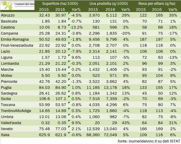 ISTAT ha appena pubblicato la versione definita dei dati di produzione di vino in Italia nel 2016. I dati inizialmente pubblicati sono stati rivisti al rialzo di 1.5 milioni di ettolitri circa, da 50.1 milioni a 51.6 milioni, per quanto riguarda la produzione di vino esclusi i mosti, mentre se includiamo i mosti il totale passa a 54.1 milioni di ettolitri. Chi ha visto i dati pubblicati a marzo scorso tenga conto che gran parte della revisione al rialzo riguarda i vini rossi, mentre da un punto di vista “qualitativo” la revisione al rialzo tocca soprattutto i vini IGT e da tavola, che sono rispettivamente stabili e in crescita del 18%. Si riconfermano dunque le conclusioni di qualche mese fa: il 2016 e’ un ottimo anno, il 16% sopra la media storica, ma chiaramente la maggior produzione si e’ “scaricata” nel segmento meno nobile della produzione, i vini comuni, mentre per quanto riguarda i vini DOC e i vini IGT, per quanto ben sopra le medie storiche, stiamo parlando di dati molto simili a quelli dello scorso anno. Trovate anche nel post una tabella con il riassunto delle superfici vitate, dell’uva prodotta e della resa per ettaro a livello regionale, che non avevo mai composto. Buona lettura.