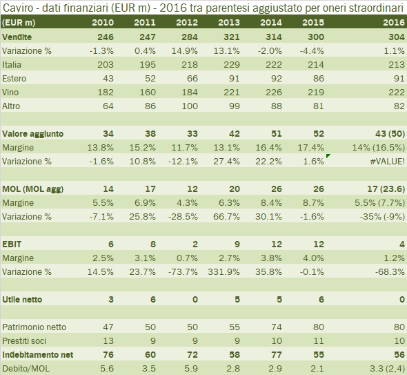 Il bilancio 2016 di CAVIRO mostra un netto calo degli utili a fronte di un fatturato in leggero incremento. Ciò è in buona parte dovuto a una serie di oneri straordinari (7 milioni) che sono stati contabilizzati nel 2016 per l’adeguamento ai nuovi principi contabili recentemente introdotti in tema di oneri pluriennali.. Nel complesso, i soci della cooperativa hanno ricevuto il 4% in più dell’anno scorso per i prodotti apportati, essenzialmente grazie all’incremento dei volumi. La performance commerciale del gruppo vede un netto incremento delle vendite all’estero, tutto generato fuori dai confini dell’Unione Europea, e una sostanziale tenuta dell’attività italiana, dove il prodotto di punta, il Tavernello, soffre un po’ per lo spostamento dei consumi nelle fasce premium del mercato, pur restando il vino in assoluto più venduto. Proprio verso questa categoria di prodotti il gruppo continua a investire. CAVIRO sta moltiplicando le iniziative all’estero per esportare il successo di questo prodotto. Importanti accordi sono stati siglati sia nel mercato inglese che in quello cinese, mentre in USA CAVIRO ha deciso di effettuare un investimento diretto per importare i propri prodotti. Le prospettive per il 2017 sono un po’ incerte: nel mercato italiano l’azienda ha aumentato i prezzi, mentre all’estero viene chiaramente menzionato come rischio il potenziale rallentamento in Gran Bretagna e l’adozione di dazi di importazione.