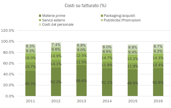 - I risultati finanziari consolidati come abbiamo detto sono influenzati da 7 milioni di oneri straordinari. Il MOL scende del 35% a 17 milioni, ma sarebbe stato 24 senza questi oneri (-9%). Da una rapida occhiata alla struttura dei costi, va rilevato un leggero incremento del costo del packaging (probabilmente dovuto alla “premiumizzazione” del portafoglio) e un livello di pubblicità e promozioni (28 milioni) stabili rispetto al 2015.