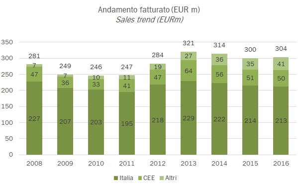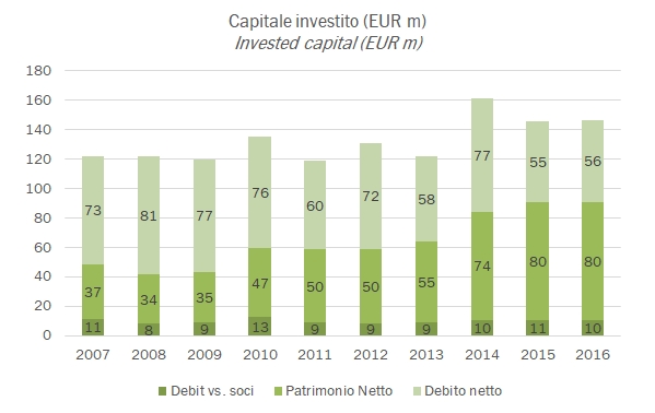 - L’indebitamento del gruppo resta sostanzialmente invariato a 56 milioni di euro, dopo il forte miglioramento del 2015 (riconducibile al capitale circolante), oltre agli ormai ricorrenti 10 milioni di debito nei confronti dei soci. Ciò corrisponde a un rapporto di 3.3 volte il MOL consolidato (2.4 volte se aggiustato per le partite non ricorrenti). Gli investimenti del 2016 sono stati circa 9 milioni di euro, contro i 13 del 2015, mentre il capitale circolante quest’anno non ha apportato alcun contributo.