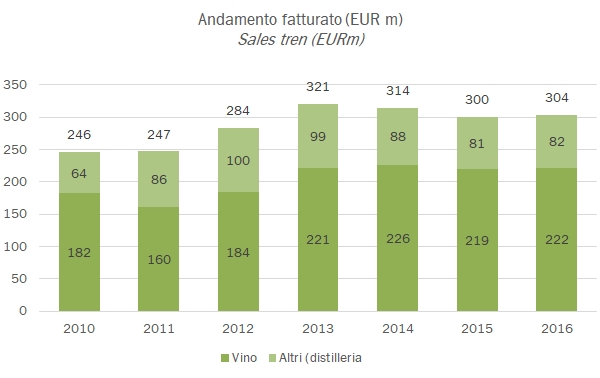 - Le vendite di 304 milioni di euro sono in crescita dell’1%. Di queste, 222 milioni sono vendite di vino, mentre circa 82 sono derivanti dalle attività di trattamento dei sottoprodotti ed Energia da fonti rinnovabili (distilleria). L’Italia rappresenta 213 milioni di euro, -1%, mentre l’Europa con 50 milioni di euro è in calo del 2%. A compensare questi cali è un incremento del 17% delle vendite al di fuori dell’Europa, che passano da 35 milioni a 41 milioni di euro.