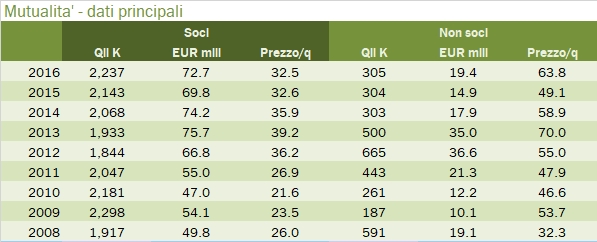 - La liquidazione dei prodotti apportati dai soci cresce del 4% a 73 milioni di euro, con un incremento dei volumi dello stesso tenore. Secondo la relazione degli amministratori il prezzo medio di liquidazione dei conferimenti ordinari è cresciuto del 3.7%.