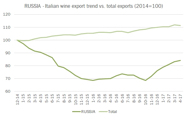 L’andamento delle esportazioni di vino si caratterizza quest’anno per un’estrema volatilità. Le belle parole spese per commentare i dati di marzo (+15%) sarebbero da ribaltare per i dati di aprile, che invece sono in calo del 4%. Lo spostamento temporale delle vacanze Pasquali ha naturalmente un impatto. Mi pare che la conclusione più ovvia sia quella di mettere insieme i due mesi marzo-aprile, o ancora meglio i primi 4 mesi dell’anno. Il risultato è molto simile: +5.3% nel primo caso, +4.7% nel secondo caso. Questa è la velocità di crociera del nostro vino, fatto per il 70% (+3%) dall’aumento dei volumi e per l’1.5% (quindi circa il 30%) dal miglioramento del prezzo mix. Ma l’analisi più interessante nasce dall’osservazione dell’andamento dei 10 principali mercati: di questi, soltanto due, Canada e Francia, sono sopra il +4.7% dei primi 4 mesi. Un rapido calcolo consente di calcolare che questi 10 mercati, che sono per noi l’80% del nostro export crescono del 3.1% nel periodo gennaio-aprile, mentre il restante 20% del mercato cresce dell’11%. Forse la sperata diversificazione geografica sta cominciando a materializzarsi. Per questo, nel post trovate (e nei prossimi post troverete) nuove analisi sull’andamento dei mercati “secondari” ma in rapida crescita. Oggi partiamo con Russia (in recupero) e Cina (in accelerazione). Per chi vuole, il post prosegue.