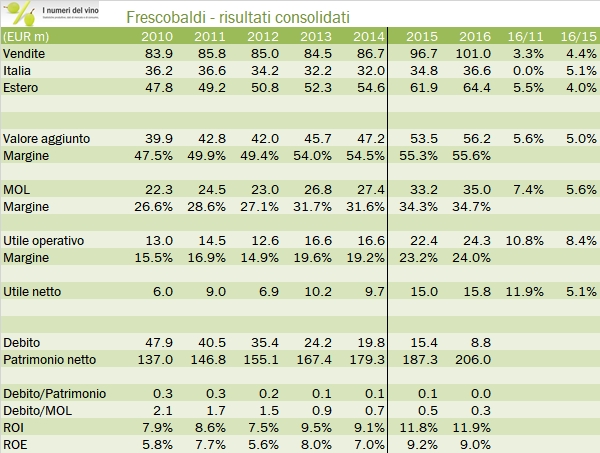 Frescobaldi chiude il 2016 con un altro bilancio molto positivo, con una crescita delle vendite e degli utili compresa tra il 4% (vendite, per la prima volta sopra 100 milioni) e l’8% (utile operativo), una ulteriore riduzione dell’indebitamento sotto 10 milioni di euro, che consente all’azienda di investire in nuove opportunità. In aprile, Frescobaldi ha chiuso un contratto per l’acquisizione di una tenuta nella zona del Brunello di Montalcino per 8.4 milioni di euro (di cui 4 già spesati nel corso del 2016), mentre l’azienda potrebbe essere chiamata ad acquistare il 4.15% della controllata Ornellaia e Masseto (ora detenuta al 69%) per circa 15 milioni (annotate: per una valutazione di 315 milioni di euro del 100% della controllata). La previsione per il 2017 indica una nuova moderata crescita (sia in Italia che all’estero), che essendo “costruita” su una serie di anni molto positivi segnala l’ottima salute in cui versa Frescobaldi. Prima di addentrarci nei dati, una piccola annotazione: i dati 2015 sono riclassificati per tenere conto di una riforma dei principi contabili che ha leggermente alterato alcune voci del conto economico (trattamento degli oneri straordinari) e dello stato patrimoniale. Poca cosa. Passiamo ai numeri.