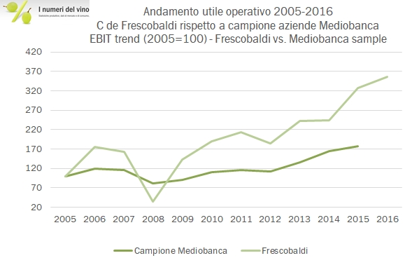 • I margini sono in leggero progresso: il margine industriale sale dal 55.3% al 55.6% delle vendite, per un valore assoluto di 56 milioni di euro (+5%). I costi operativi crescono in linea con le vendite, per un MOL di 35 milioni, +6%, mentre gli ammortamenti stabili determinano un progresso dell’8% dell’utile operativo (un grafico con il confronto con il rapporto Mediobanca offre una visione della forte progressione di Frescobaldi rispetto al settore).