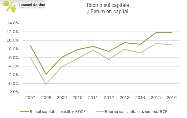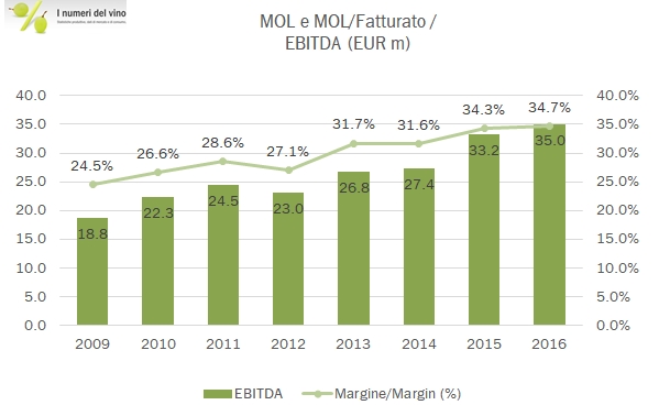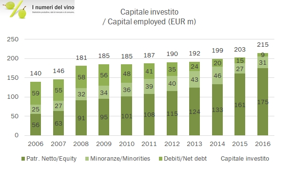 • La struttura finanziaria migliora ulteriormente. Nel 2016 sono stati distribuiti 4 milioni di dividendi (rispetto alla distribuzione “straordinaria” di 13 milioni del 2015) e sono stati investiti 12 milioni (incluso un anticipo di 4 milioni per l’acquisizione a Montalcino). Con una generazione di cassa di nuovo superiore a 20 milioni di euro, l’indebitamento netto scende a 8 milioni, il livello della storia recente del gruppo, il che lascia spazio per immaginare nuove operazioni di crescita esterna.