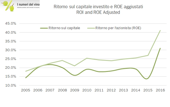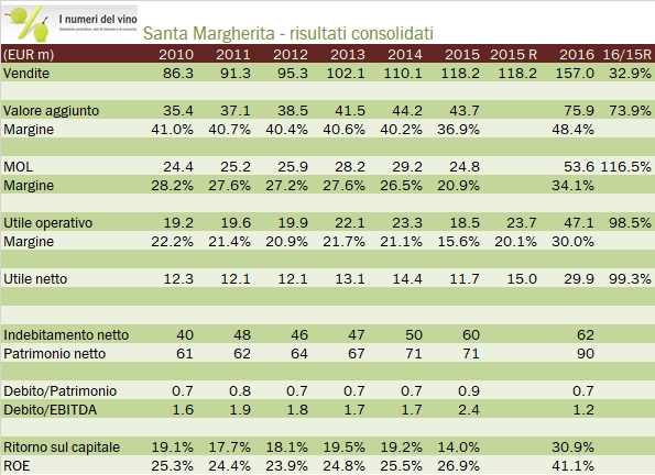 Nel 2016 Santa Margherita ha raccolto i frutti dell’integrazione a valle nella distribuzione in USA, suo più importante mercato, che nel 2015 avevano determinato un deciso appesantimento dei conti strumentale all’inizio dell’operatività. I dati del bilancio sono clamorosamente migliori degli anni passati, sia in termini di crescita delle vendite, +32%, di cui si può stimare che il 25% circa derivi dal “mark-up” delle operazioni americane, ma soprattutto in termini di utili, che per dirla breve sono il doppio degli anni passati (da 24 milioni – 2015 aggiustato – a 47 milioni di euro di utile operativo e da circa 15 milioni – 2015 aggiustato – a 30 milioni di utile netto).