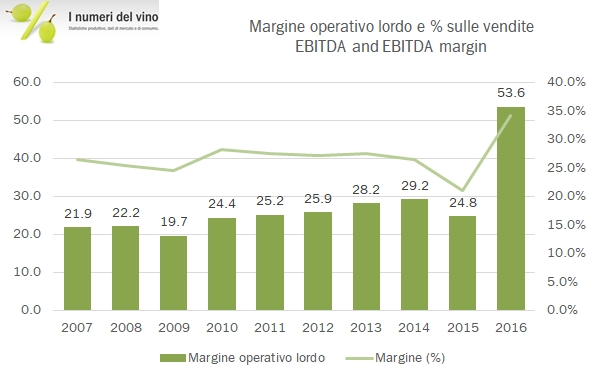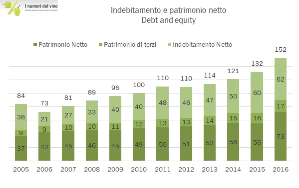 - Il debito è praticamente stabile a 62 milioni di euro (60 nel 2015) a fronte di un deciso incremento degli investimenti: 13 milioni per Santa Margherita (3 nel 2015) per via della costruzione della nuova cantina, 9 milioni per Ca del Bosco (4 nel 2015), oltre agli investimenti fondiari in nuovi vigneti della società agricola che hanno comportato un apporto di oltre 4 milioni di euro.