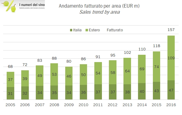 - Le vendite 2016 sono balzate del 33% a 157 milioni, con un incremento del 9% in Italia, che stimiamo generare un fatturato di circa 47 milioni e, come abbiamo commentato, il balzo nelle vendite all’estero, +48% a circa 109 milioni di euro.