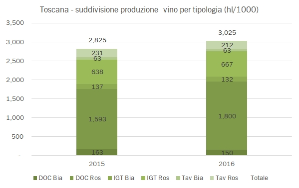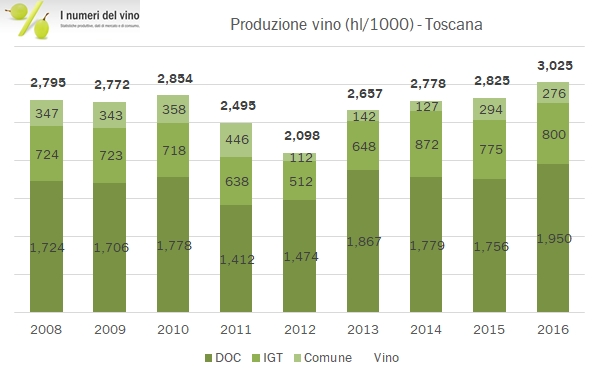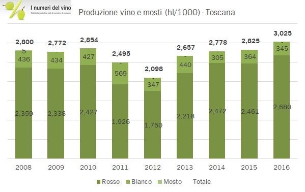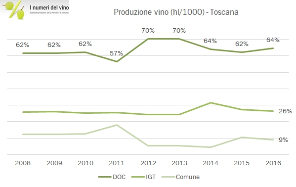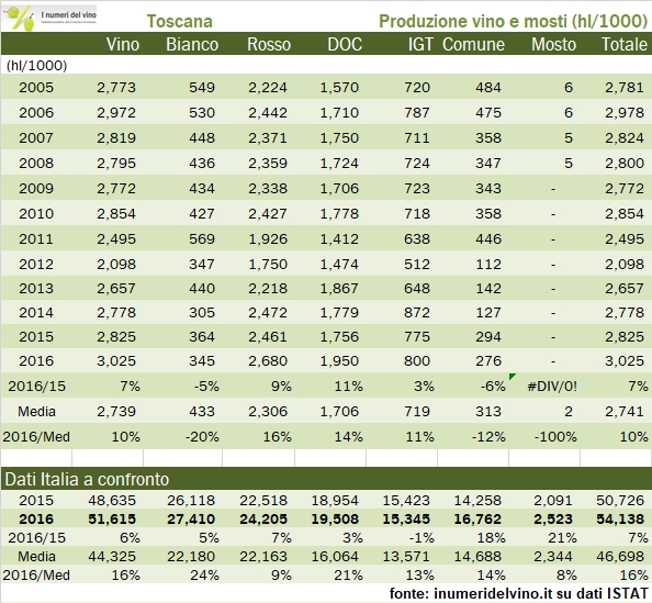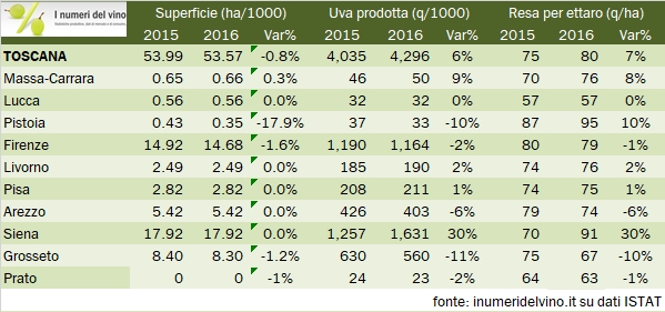 In Toscana nel 2016 si è prodotto per la prima volta da molti anni oltre 3 milioni di ettolitri di vino, quindi il 7% più del 2015 e il 10% più della media storica. In Italia il 2016 è stato in confronto il 6% più del 2015 e il 16% superiore alla media storica. La produzione si caratterizza sempre di più per i vini rossi (il 22% dei vini DOC rossi sono prodotti qui), e per i vini di qualità, anche se nel corso degli ultimi due anni i vini da tavola sono stati il 10% della produzione, rispetto ai minimi storici del 5% di qualche anno fa. I dati sulle superfici vitate ci segnalano invece un leggerissimo calo a 53600 ettari, soprattutto localizzato nelle province secondarie. Passiamo ai dati.