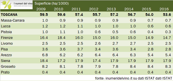 • La superficie vitata toscana secondo ISTAT è calata marginalmente a 53600 ettari, soprattutto a causa delle province di Pistoia e Grosseto, mentre i dati relativi alle province chiave, Siena e Firenze per intenderci, sono invariati rispetto allo scorso anno.