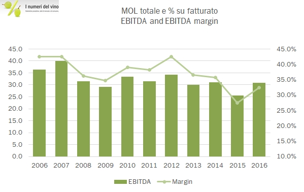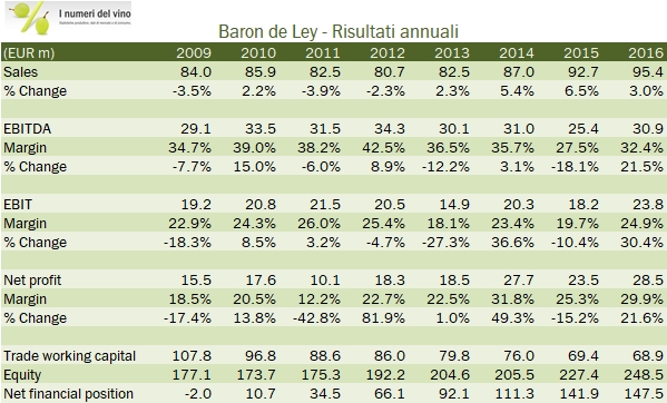 Baron de Ley ha chiuso un 2016 in recupero, non tanto in termini di vendite, cresciute del 3%, ma soprattutto in termini di utili che hanno beneficiato di un forte miglioramento del margine industriale dopo l’andamento particolarmente negativo del 2015. Siamo lontani dai margini industriali degli anni scorsi (35% e più a livello di EBITDA), ma il livello del 2016 del 32% resta ai vertici del settore a livello mondiale. BdL resta molto ricca dal punto di vista finanziario, con 147 milioni di euro di cassa netta, ma anche da quello patrimoniale con oltre 900 ettari vitati di proprietà. La politica di remunerazione degli azionisti resta molto prudente e incentrata sul riacquisto di azioni, per 3.5 milioni nel 2016, impiegando dunque circa il 10% della generazione di cassa, circa 35 milioni di euro annui. L’andamento borsistico di BdL (che ha un valore di mercato di circa 480 milioni di euro) ha soltanto parzialmente recepito queste buone notizie e ha messo a segno un rialzo dell’8% nel 2016, mentre ha perso il 6% fino ad ora nel 2017. Passiamo all’analisi dei dati.