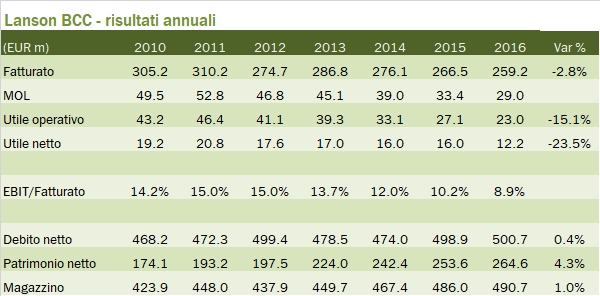 I dati che analizziamo oggi sono la diretta conseguenza delle considerazioni che facevamo sulle vendite di Champagne e sull’impatto del calo del mercato inglese (in volume ma anche in valore visto l’andamento della sterlina) nel secondo semestre 2016. Proprio i cambi sono stati una delle maggiori determinanti del calo di vendite accusato da Lanson nel 2016 (-3%), anche se bisogna ammettere che i dati non sono buoni anche riaggiustati per questo fattore. Il mercato francese è in calo strutturale da anni, i margini sono sempre più bassi e il debito resta molto elevato (anche se quasi completamente coperto dal valore del magazzino). Ancora peggiori sono i numeri del secondo semestre, quando le vendite sono crollate del 7% e gli utili del 40% circa. Come da copione non c’è un’indicazione sul 2017 ma la solita generica considerazione che si lavora per il lungo termine, anche perché il breve termine è meglio non guardarlo. Passiamo ai numeri.