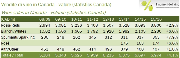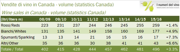 - Il mercato canadese del vino sfiora quota 5 milioni di ettolitri nel 2015/16, con una crescita del 3.3%. In termini di valore, stiamo parlando di 6.97 miliardi di dollari canadesi, quindi al cambio attuale circa 4.65 miliardi di euro.