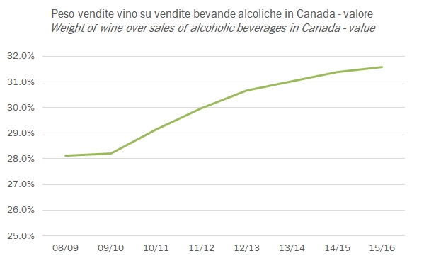La crescita del mercato del vino canadese non si interrompe neppure nel 2015/16 (leggi: aprile 2015-marzo 2016), nonostante la svalutazione del cambio e il prezzo del petrolio che non si riprende, due fattori piuttosto importanti nel paese. Per i canadesi il vino rappresenta circa il 32% della spesa totale per le bevande alcoliche, con una penetrazione crescente negli anni che sembra peraltro stabilizzarsi. La spesa in vino è poco sotto 7 miliardi di dollari canadesi (4.6-4.7 miliardi di euro), in crescita del 4%, con un volume cresciuto del 3.3% a 496 milioni di litri (dunque 4.96 milioni di ettolitri). I trend che leggerete nel resto del post sono i soliti: vini spumanti in crescita importante, seguiti dai vini bianchi, mentre i vini rossi hanno un andamento inferiore a quello del mercato. Salvo che per i vini rossi, nel caso degli spumanti e dei vini bianchi la quota di mercato dei vini importati tende a crescere. Per chi è interessato mettiamo qualche dettaglio nel resto del post.
