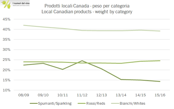 - La seconda analisi riguarda il bilanciamento tra vini locali e vini importati. Anche in questo caso, i canadesi sembrano prediligere in modo crescente i prodotti esteri, fatta eccezione per i vini rossi, dove però i prodotti locali sono soltanto il 25% del mercato (contro il 40% circa dei vini bianchi).
