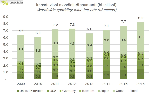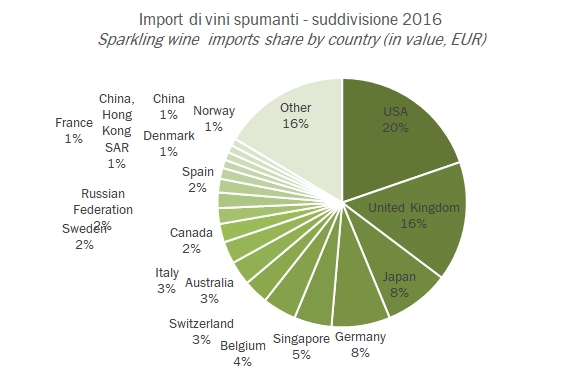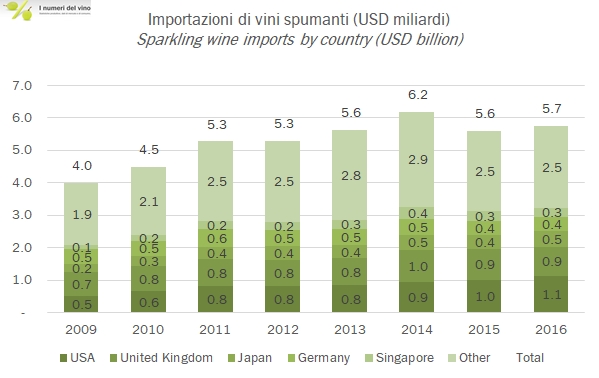 La stabilità dell’euro/dollaro ha ridato coerenza ai dati del trade mondiale di spumanti nel 2016 nelle diverse valute L’incremento delle importazioni di spumante nel 2016 è stato del 3% a 5.75 miliardi di dollari o 5.2 miliardi di euro (come per l’anno scorso il dato calcolato dalle dichiarazioni di export è leggermente superiore, circa 5.98 miliardi di dollari). Gli importatori in crescita a doppia cifra sono gli USA, che superano il miliardo di euro di import, il Giappone che è il terzo mercato mondiale per la categoria e, partendo da valori molto più limitati, la Russia, dove però il dato 2016 rappresenta il primo numero positivo dopo due anni di forte calo. Dall’altra parte, e non è una sorpresa, troviamo il Regno Unito, -5%, ma anche Singapore (-8%) o il Belgio (-4%). Passiamo all’analisi dei dati.