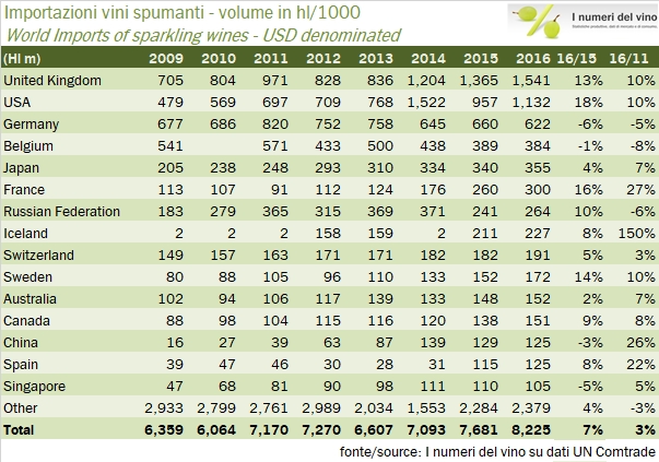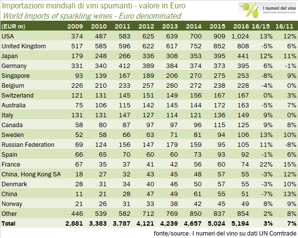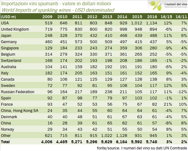 - Con qualche piccola rettifica per “recuperare” i dati dei paesi mancanti ancora all’appello (circa l’1% del totale) arriviamo a un dato di 5.2 miliardi di euro di importazioni di spumante nel mondo nel 2016, o 5.75 miliardi di dollari, con una crescita del 3% sul 2015 e, se visto in Euro, un trend quinquennale del 7% annuo (2% in dollari).
