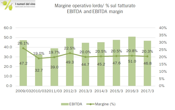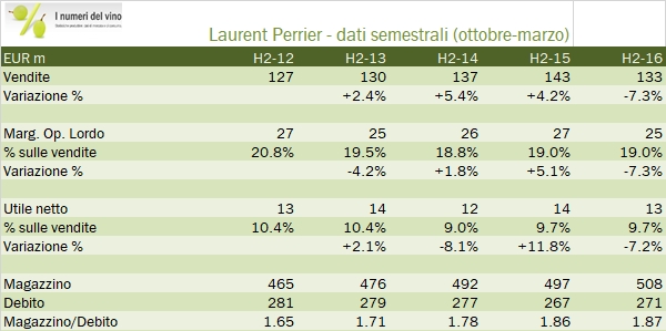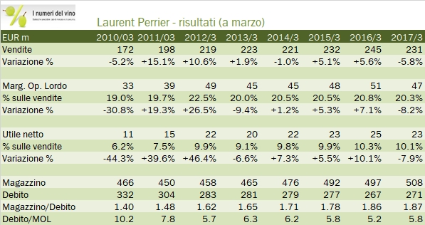 Laurent Perrier ha subito come i suoi concorrenti il forte rallentamento del mercato inglese, legato alla Brexit e alla corrispondente svalutazione della sterlina. Chi legge il blog sa che dei tre piccoli produttori (Lanson BCC, Vranken Pommery sono gli altri due), Laurent Perrier è quello con i risultati normalmente migliori, sia dal punto di vista commerciale che dei margini. Così è stato anche nel 2016 (che per LP significa 12 mesi a marzo 2017), anno in cui l’azienda ha perso il 6% in termini di vendite (di cui il 2% a causa dei cambi) ma ha mantenuto i margini quasi stabili. Risultato finale: un utile operativo in calo dell’8% contro il meno 10-15% dei due concorrenti. Nel frattempo i programmi di sviluppo e di investimento dell’azienda non si fermano, nonostante il 2017 non porta buone notizie, a causa del taglio dei volumi produttivi legati alla gelata primaverile. Passiamo all’analisi dei dati.