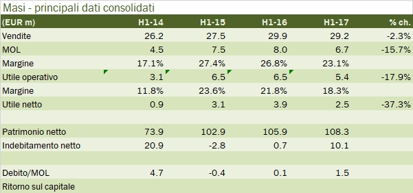 L’andamento di Masi nel primo semestre è stato decisamente negativo, in parte a causa di un confronto sfidante relativo ai primi mesi dello scorso anno. Le vendite calano del 2% circa, nonostante ci sia il contributo di Canevel, consolidata dalla seconda metà dello scorso anno che ha contribuito per il 5-6% delle vendite. Mentre per molti player del settore il problema è soprattutto domestico, nel caso di Masi la situazione è contraria: le vendite in Italia vanno a gonfie vele, grazie al nuovo wine shop di Lazise (a proposito, oltre ai vini buoni si mangia bene al giusto prezzo), al consolidamento di Canevel e alla ristrutturazione della forza vendita. Invece, nei mercati europei e nel “promettente” Nord America l’andamento resta negativo a causa della forte pressione concorrenziale, soprattutto nei mercati monopolistici. A tutto questo si aggiunge lo sforzo di “coprire” il buco dell’annata 2014 sui vini pregiati e la mancanza di 1 milione di euro di contributi OCM (disgrazia peraltro condivisa da numerose altre aziende di cui abbiamo analizzato qui i risultati). Sebbene il management non si spinga a fare considerazioni sul futuro (e per quanto le vendite di luglio e agosto siano superiori allo scorso anno), sembra difficile un significativo cambio di direzione nel secondo semestre, a meno di mettere a segno una nuova acquisizione. Il titolo in Borsa tratta tra EUR4.3 e EUR4.5, leggermente sotto il prezzo di quotazione di EUR4.6 di ormai 2 anni fa. Nel frattempo sono stati distribuiti circa EUR0.3 per azione in dividendi. Certamente un andamento non soddisfacente per chi ha acquistato le azioni, anche in considerazione del positivo andamento della borsa italiana nel frattempo. Passiamo ai dati.