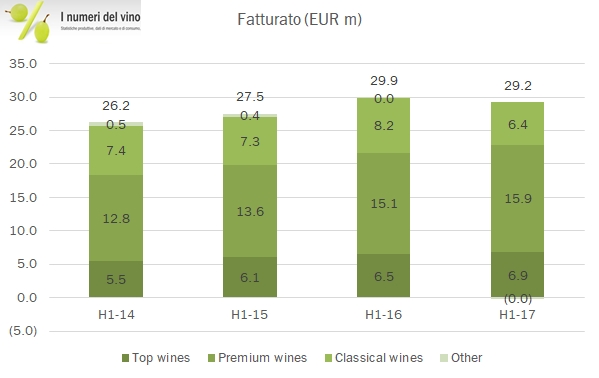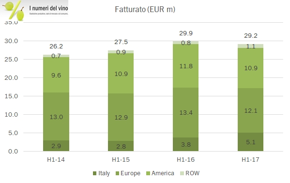 - Dal punto di vista dei prodotti, le vendite di vini pregiati sono in crescita del 5%, così come quelle di premium wines (10-25 euro sullo scaffale) a +5%, mentre calano del 22% le vendite dei classical wines. Dal punto di vista geografico invece l’Italia cresce del 34%, l’Europa perde il 10% (contro -6% del secondo semestre 2017), l’America è a -8% (contro -4%) e il resto del mondo (poco rilevante) cresce del 32%.