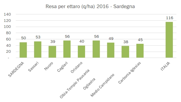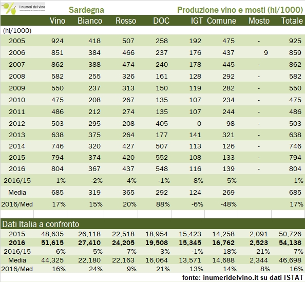 - Nel 2016 si sono prodotti in Sardegna 804mila ettolitri, l’1% in più del 2015 e il 17% in più della media storica. Guardando il grafico è evidente che si tratta di un livello “di massimo”. In realtà nel 2006-07, che non sono nel grafico, la produzione tocco quota 850-900mila ettolitri.