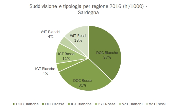- I vini rossi sono molto più rappresentati nelle categorie IGT e vini comuni. I primi sono cresciuti dell’8% nel 2016 a 116mila ettolitri, con un +4% dei vini rossi a 83mila ettolitri e un balzo a 34mila ettolitri dei bianchi che però non è significativo in termini assoluti. Nella categoria dei vini comuni la produzione 2016 è salita del 5% a 139mila ettolitri e rappresenta il 17% della produzione sarda di vino. Anche in questo caso ben 106mila ettolitri dei 139mila sono di vino rosso, +6%, rispetto a un valore stabile, di nuovo a 34mila ettolitri dei vini bianchi.