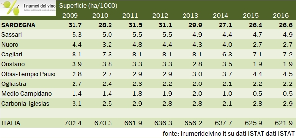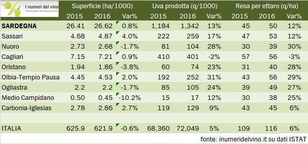 - La superficie vitata secondo ISTAT cresce dell’1% circa a 26600 ettari dopo un triennio di significativi cali. Come vedete in tabella i dati sono piuttosto variegati a seconda delle province. Nelle più importanti, Cagliari cresce dell’1% a 7200 ettari, Sassari del 4% a 4900 ettari e Olbia-Tempio Pausania del 2% a 4530 ettari. Le rese per ettaro 2016 sono in crescita del 12% secondo ISTAT, che rileva un incremento delle uve prodotte molto elevato rispetto all’incremento della produzione di vino (+13% contro +1%).