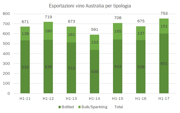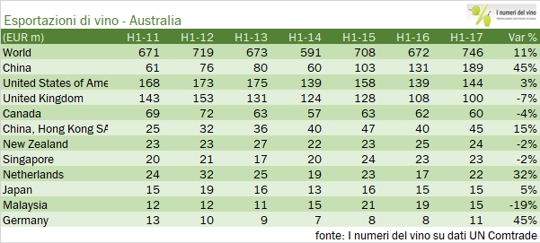 - L’Australia ha esportato vino per circa 750 milioni di euro nei primi 6 mesi del 2017, segnando un incremento dell’11-12%. Come vedete dal grafico non si tratta di un valore eccezionalmente elevato, visto l’andamento calante degli ultimi anni. Va però sottolineato che si innesta in un momento in cui il cambio non sta più aiutando gli australiani come un tempo.