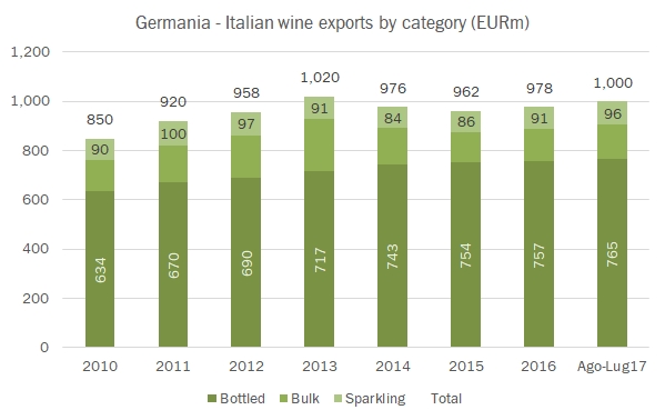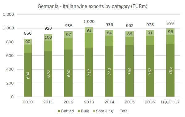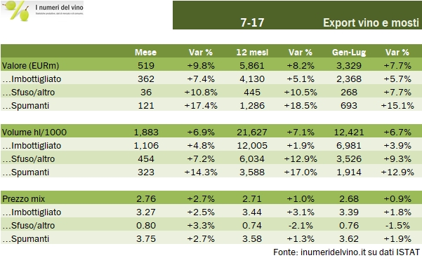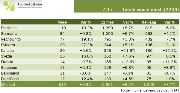 - L’export dei primi 7 mesi tocca quota 3.3 miliardi di euro per un volume di 12.4 milioni di ettolitri, per un incremento rispettivamente dell’8% e 7%. Il mese di luglio in particolare segna un +10% a 519 milioni di euro per un volume di 1.9 milioni di ettolitri, +7%.