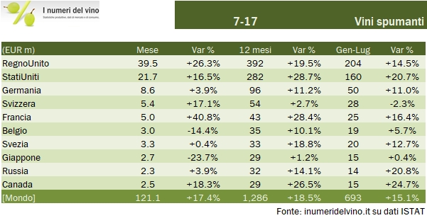- Andando nei dettagli per prodotto, nel segmento degli spumanti 4 dei primi 5 mercati sono in crescita di oltre il 10%. Soltanto il mercato svizzero ha dato dei segni di debolezza di inizio anno, che però non si confermano in luglio. Inutile dire che l’incremento del 26% dell’export nel Regno Unito (+14% sui primi 7 mesi) è un dato molto buono, anche se qualche dubbio circa i margini che realizziamo in questo segmento a me viene…