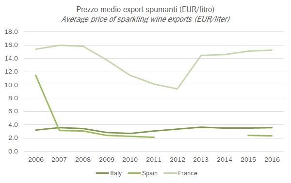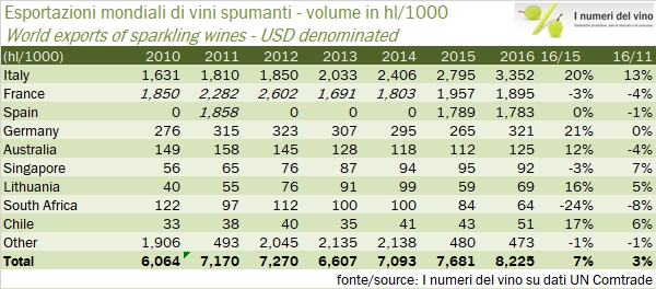 - Ah, dimenticavo la Francia, della quale è necessario dedicare almeno un paragrafo. Le esportazioni di Champagne secondo UN Comtrade non sono salite nel 2016, anzi hanno perso il 2%. Un calo completamente derivante dalla riduzione dei volumi esportati, dove non è difficile intravedere un trend strutturale negaativo, compensato dal lavoro eccezionale che i francesi fanno per valorizzare il loro prodotto. Cinque anni fa veniva venduto a 10 euro circa al litro, oggi siamo sopra i 15 euro…
