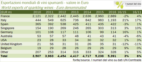 - Secondo i dati di UN Comtrade, rielaborati per coprire i piccoli buchi di poche nazioni, le esportazioni mondiali di spumanti sono cresciute del 3% a 6 miliardi di dollari o 5.4 miliardi di euro (quest’anno tutti e due uguali essendo il cambio medio stato stabile a 1.11 EUR/USD).
