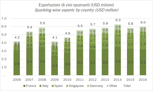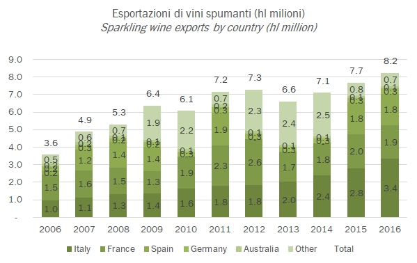 - L’Italia ricopre una posizione di prim’ordine nei volumi con 3.35 milioni di ettolitri esportati nel 2016, +20% sul 2015 e più 13% annuo dal 2011 a questa parte, mentre è seconda, molto di stante dalla Francia nel valore, 1.3 miliardi di dollari contro i 3.2 miliardi dell’export francese.