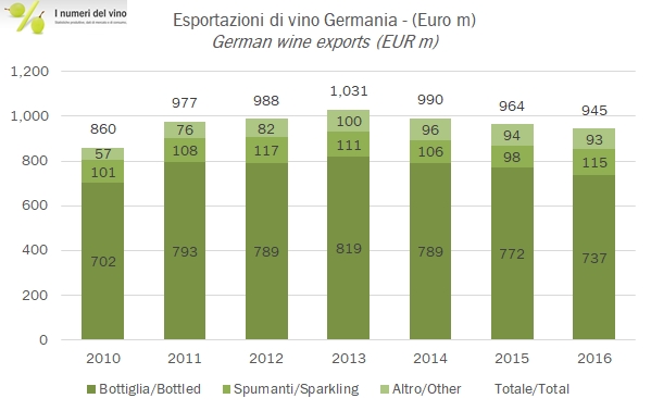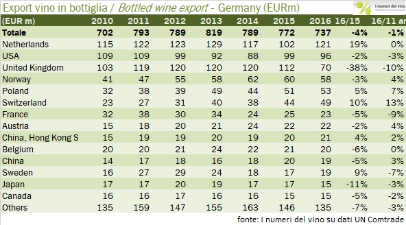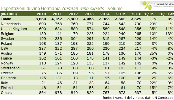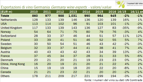 I tedeschi sono fortissimi a esportare, anzi le troppe esportazioni sono uno dei loro problemi più gravi nell’ambito dell’unione europea (il nostro è il debito…), ma nel campo del vino non eccellono. Anche nel 2016 come nei due anni precedenti le esportazioni di vino tedesco sono calate (-2%, 945 milioni di euro) con una pronunciata volatilità nell’andamento dei principali mercati. Il crollo delle esportazioni verso il Regno Unito (che resta il terzo mercato di destinazione del vino tedesco) è particolarmente pesante e di fatto controbilancia un andamento, nel resto dei paesi, leggermente positivo. I volumi di esportazione sono leggermente in calo a 3.6 milioni di ettolitri, il che significa un prezzo medio di esportazione di 260 euro per ettolitri, per la prima volta in leggera riduzione dopo anni di continuo progresso. Passiamo all’analisi dei dati.
