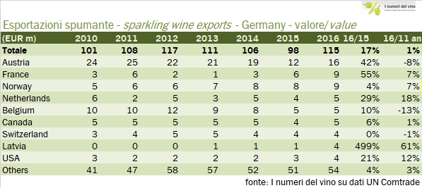 - Un cenno agli spumanti, che per la Germania rappresentano circa il 12% dell’export e che negli ultimi anni ha avuto un andamento altalenante, compreso un 2016 particolarmente positivo. Il principale mercato del “sekt” tedesco come vedete nella tabella allegata sotto è l’Austria con circa 16 milioni di euro di spumante importato su un totale di 115 milioni. Viene poi la Francia in forte crescita (+55% a 9 milioni) e sappiamo che è da mettere in relazione alla strategia di un operatore di qui pubblichiamo i dati (Schloss-Wachenheim). Viene poi la Norvegia, anch’essa con 9 milioni, in un contesto di forte dispersione delle esportazioni della categoria.