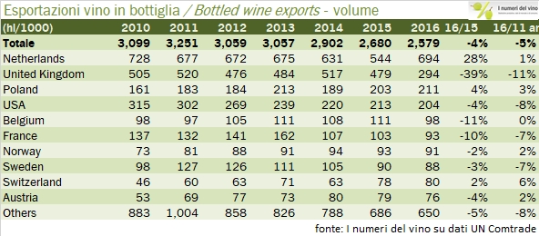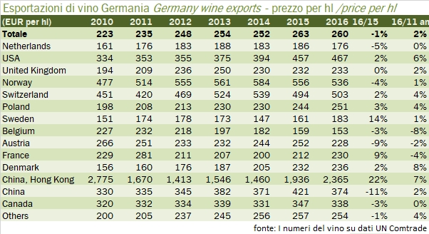 - L’Olanda per l’appunto resta la principale destinazione del vino tedesco, e torna sui livelli del 2015, con un incremento del 16% a 139 milioni di euro. Con 800mila ettolitri l’Olanda è anche la principale destinazione per volume, il che determina un prezzo all’ettolitro piuttosto basso di 176 euro. Un mercato di sbocco di vini di bassa qualità dunque (visibile anche dalla scarsa rilevanza per le esportazioni di spumante).
