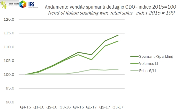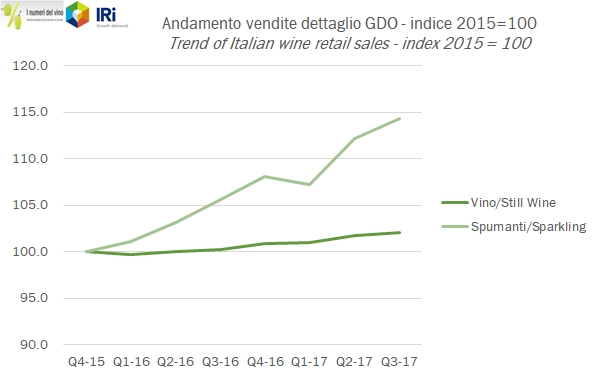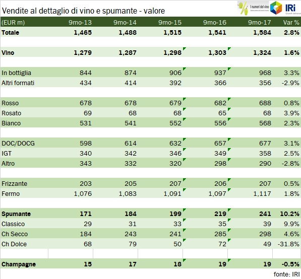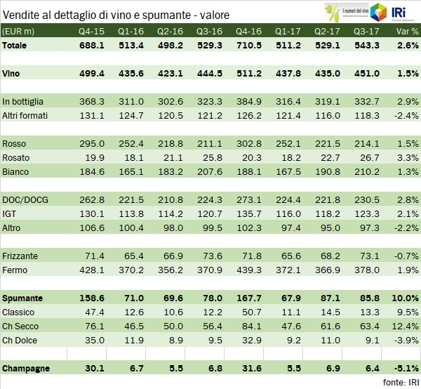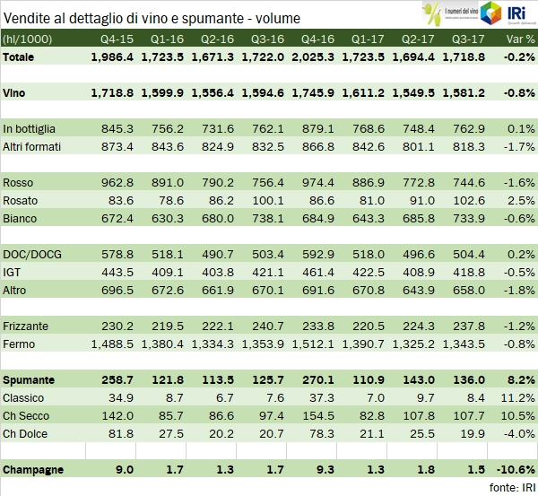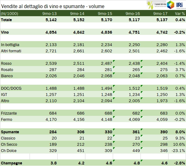 • IRI ha registrato 451 milioni di euro di vendite di vino fermo nella GDO nel terzo trimestre, +1.5%, cui si sommano 86 milioni di euro di vendite di spumanti (+10%) e 6 di Champagne (-5%). I volumi sono invece in leggero calo, -1% per il vino fermo a 1.6 milioni di ettolitri e +8% per i vini spumanti a 136mila ettolitri.