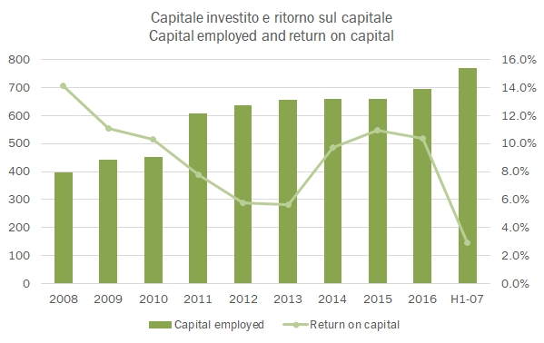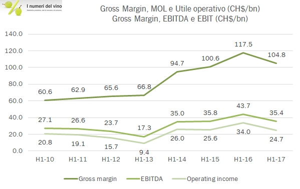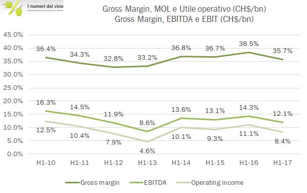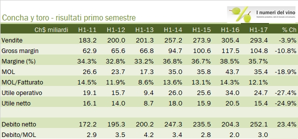 - I margini sono in netta discesa. L’utile lordo cala dell’11%, da 117 a 105 miliardi di peso, al 36% delle vendite. Ciò è dovuto all’impatto del cambio ma anche alla forte ripresa del costo delle materie prime: il vino sfuso cileno è risalito a oltre 400 peso al litro in media (55 centesimi di euro) da circa 250-260 peso medi a cui è stato quotato tra il 2014 e metà 2016. Nonostante i minori costi operativi (in parte determinati dal cambio, dato che alcune spese sono sostenute “in loco”), la riduzione dell’EBITDA si ferma a 8 milioni di euro, da 44 a 35 milioni di euro, per un margine nel semestre del 12% (dal 14% dello scorso anno). Il resto del conto economico si muove di conseguenza, con un utile netto che cala da 20 milioni a 15 milioni di euro.