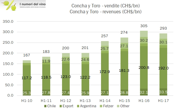 Se da un lato il vino cileno macina record in Cina, dall’altro il rafforzamento del peso ne riduce il beneficio per le aziende vinicole. E’ il caso dei risultati dei primi 6 mesi di Concha y Toro, che tra l’altro è sovraesposta ai mercati occidentali rispetto alla media dei vini cileni. I ricavi quindi calano del 4% e molto peggio va agli utili che crollano del 25% anche perché ai sacrifici fatti sui prezzi in valuta locale (dollaro e sterlina sono le principali valute) per mantenere il prodotto competitivo si combinano gli incrementi dei costi della materia prima vino nel paese, che viene da una vendemmia piuttosto povera del 2016 (10 milioni di ettolitri rispetto ai 13 del 2015) e ne ha vissuta una seconda egualmente difficile nel 2017 (9.5 milioni di ettolitri). Tutto questo ha fatto partire un processo di ristrutturazione che durerà tutto l’anno. Vedremo. Passiamo ai dati.