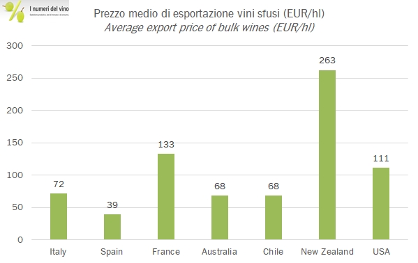- L’ultima analisi che vi propongo riguarda il prezzo medio di esportazione, che è un tema interessante anche per analizzare quelle potenziali scelte di imbottigliamento. La Nuova Zelanda esporta a 263 euro al litro, la Spagna a 39 euro al litro, l’Italia a 72 e i francesi a 133. Chiaramente stiamo parlando di prodotti che rispondono a logiche completamente differenti…