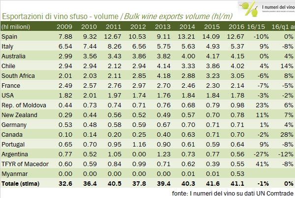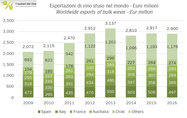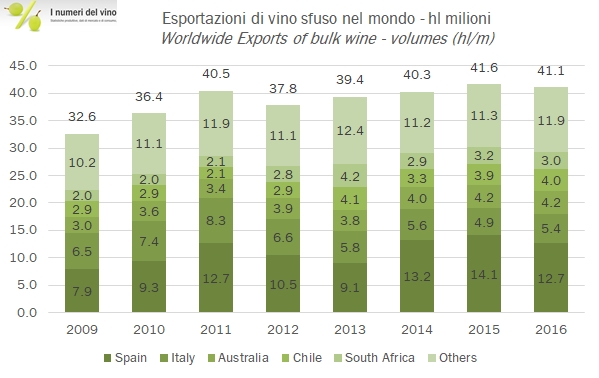 - Le esportazioni mondiali di vino sfuso sono rimaste stabili a 2.9 miliardi di euro nel 2016, con un volume cumulativo esportati stimato in circa 41 milioni di ettolitri.